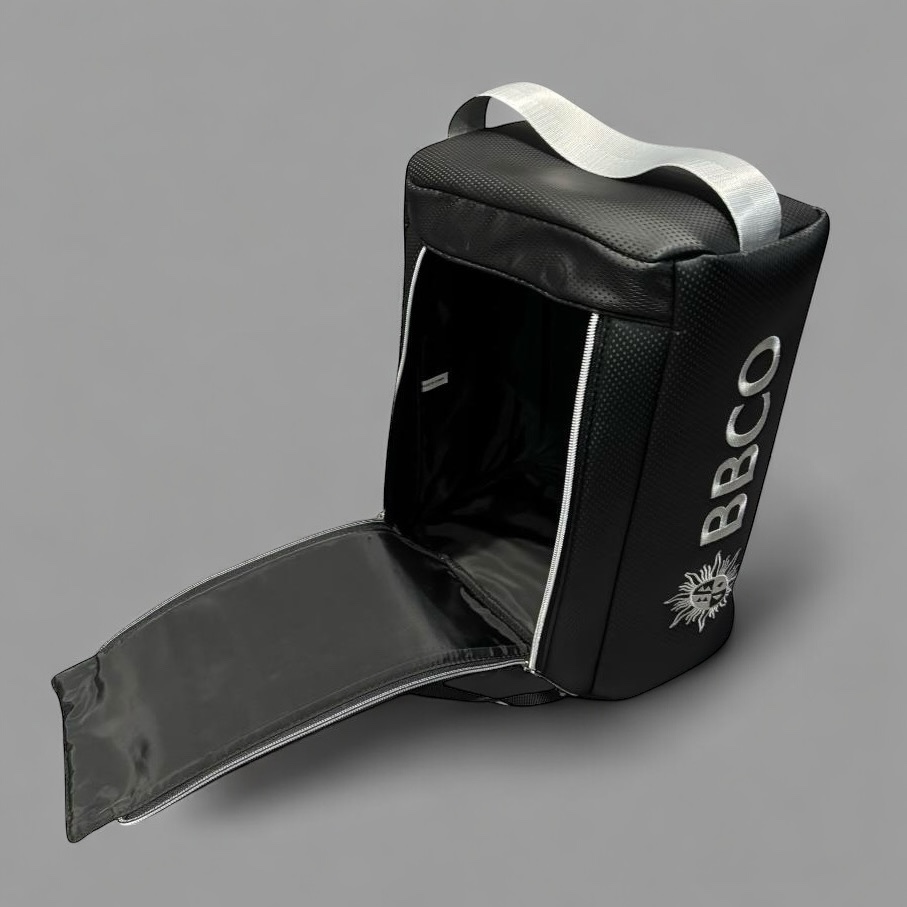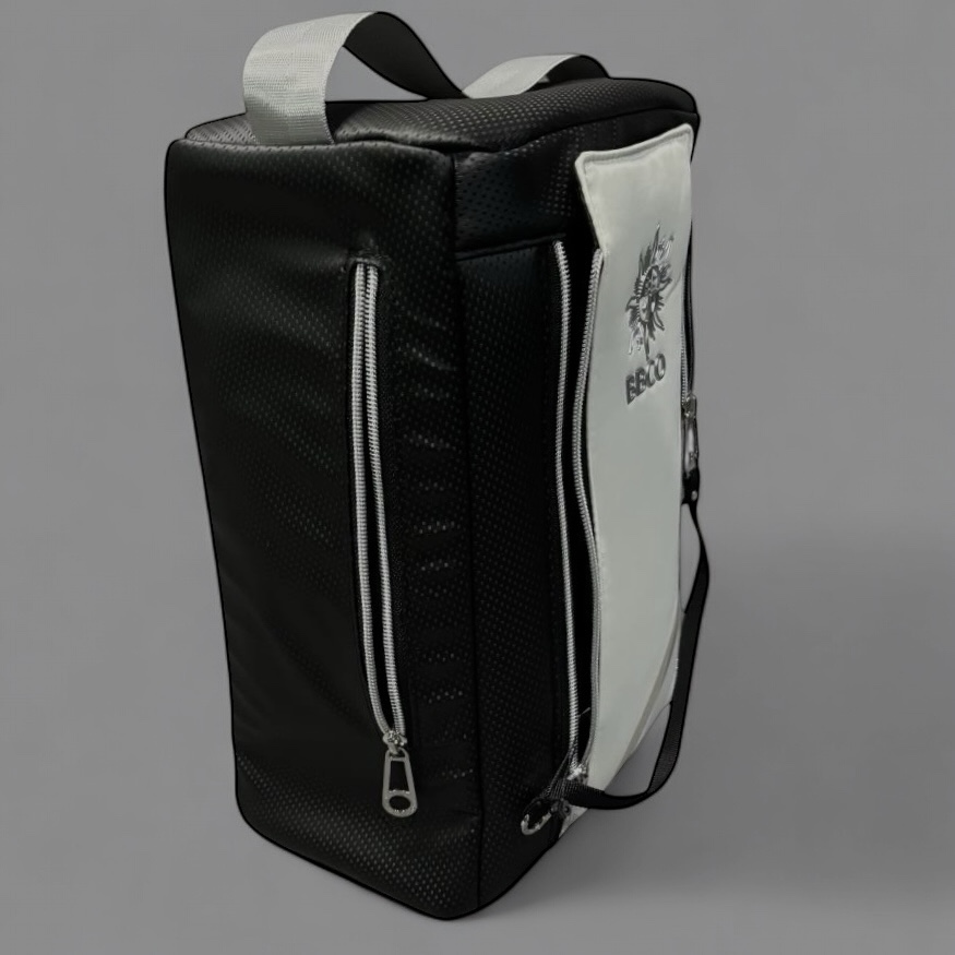 両サイドのファスナーをつなぐテープを引くことで一気に開閉ができるシューズケースが登場。