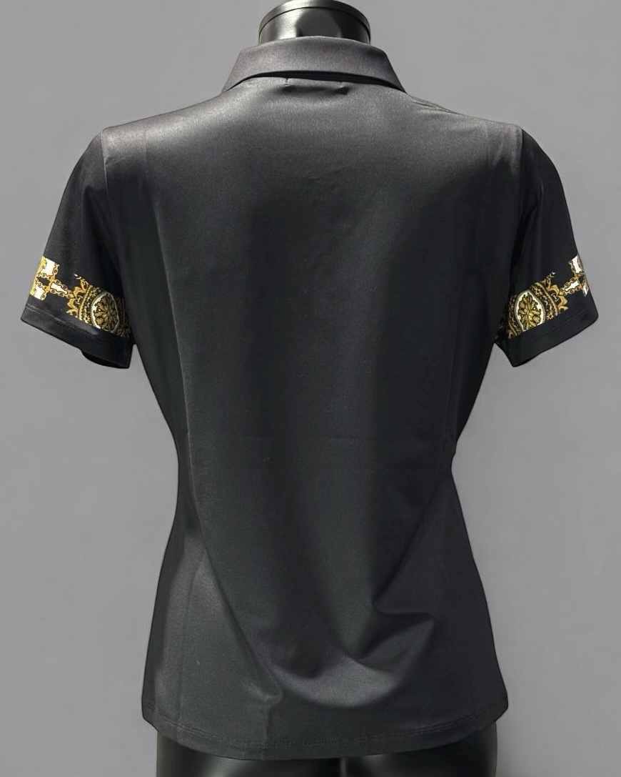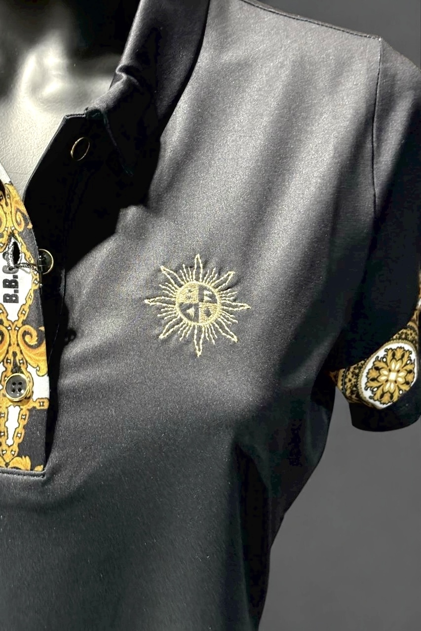 前立てと袖口にバロック調のパタ-ンプリントをあしらい、胸元の(SUN) ゴールド刺繍をワンポイントにあしらったポロシャツ。