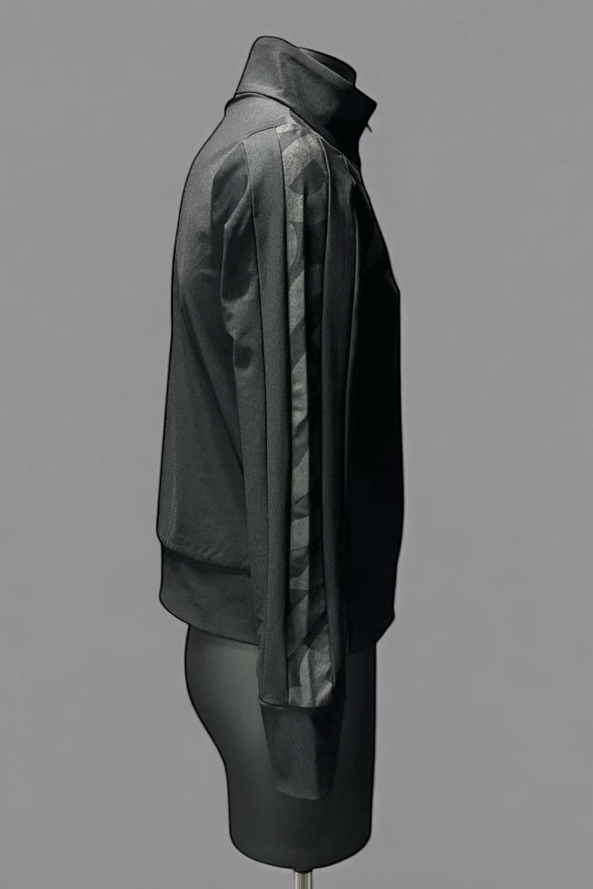 伸縮性の高いストレッチ機能素材を使用し、ブランド名とコンセプト名を英文字として大胆にプリント表現した、スポーティートラックジャケット。