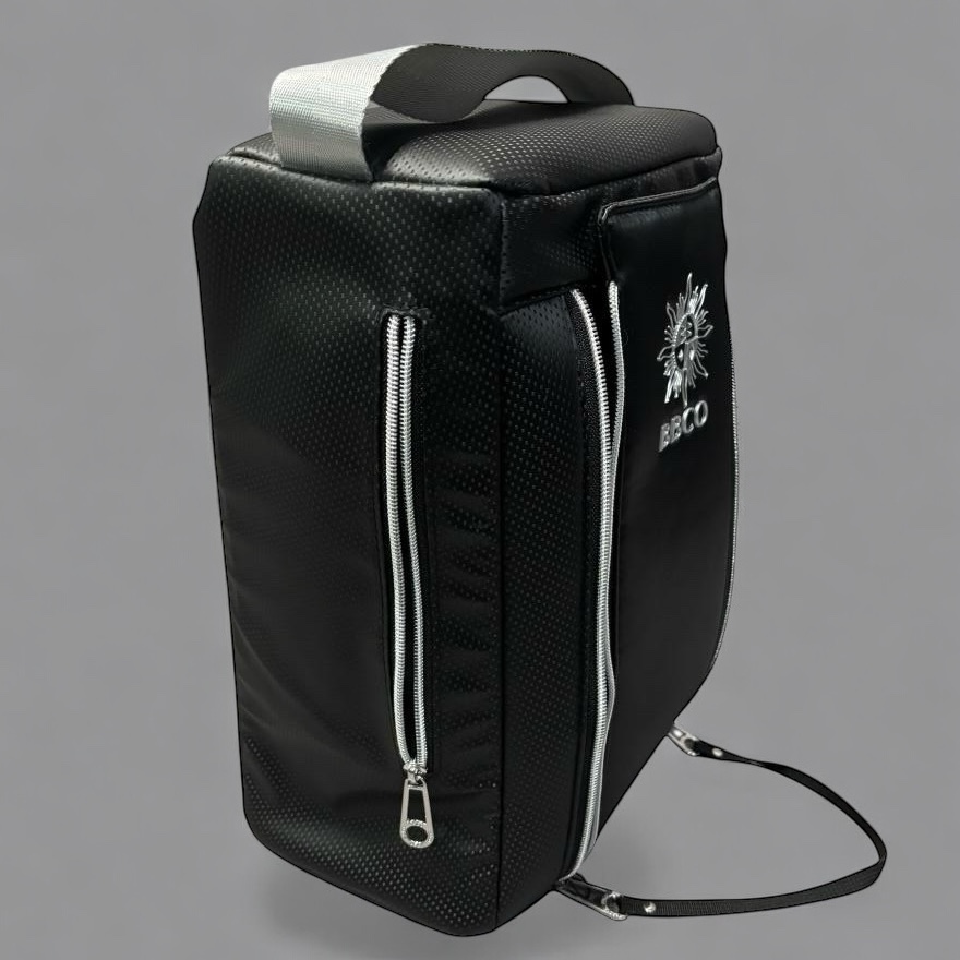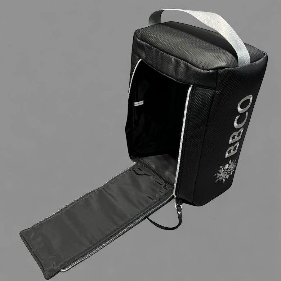 両サイドのファスナーをつなぐテープを引くことで一気に開閉ができるシューズケースが登場。